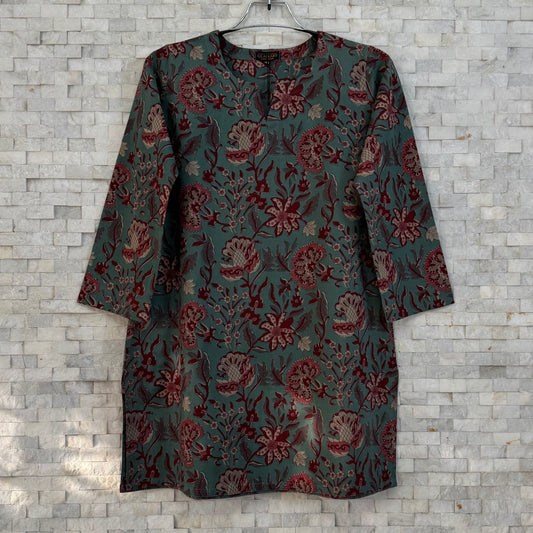 Jaipuri Cotton Short Kurti Co-ord Set – Dusty Sage Green with Maroon Floral Print