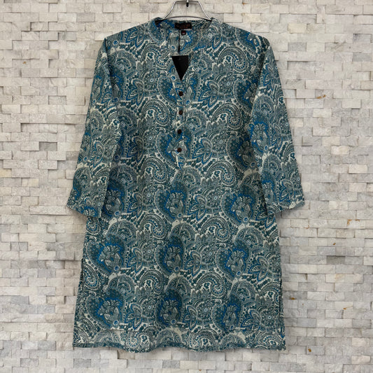 Jaipuri Cotton Short Kurti Co-ord Set – White and Teal Blue Paisley Print