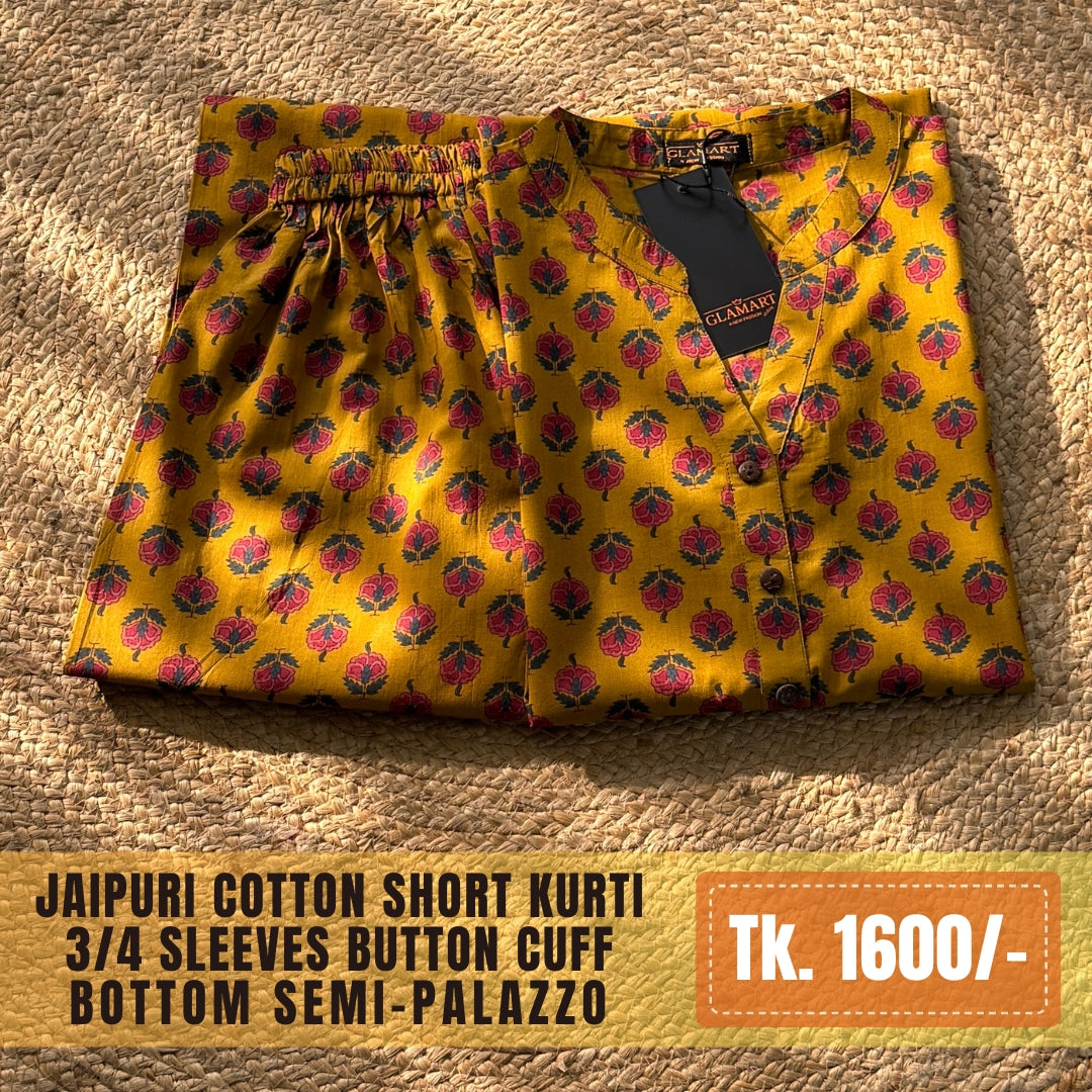 Product Code: SC0032 Set Includes: Short Kurti with Matching Bottom Kurti Length: Short Sleeves: 3/4 Sleeves with Button Cuff Neckline: Mandarin with Notch Bottom Style: Semi-palazzo Waist: Full Elastic Waistband Fit: Regular & Comfortable Fabric: Jaipuri Cotton Occasion: Daily Wear, Office, Casual Care Instructions: Gentle wash recommended
