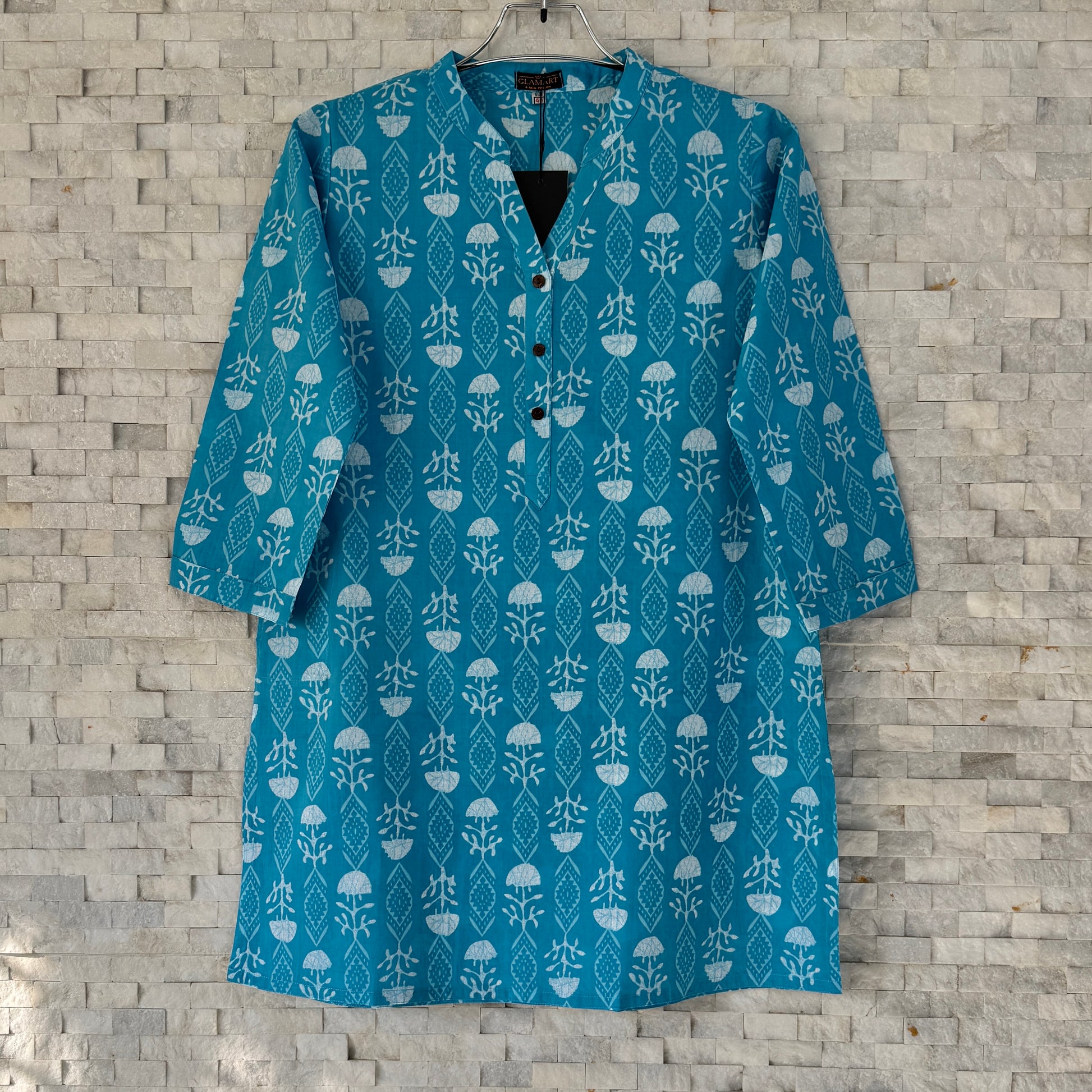 Product Code: SC0033 Set Includes: Short Kurti with Matching Bottom Kurti Length: Short Sleeves: 3/4 Sleeves with Button Cuff Neckline: Mandarin with Notch Bottom Style: Semi-palazzo Waist: Full Elastic Waistband Fit: Regular & Comfortable Fabric: Jaipuri Cotton Occasion: Daily Wear, Office, Casual Care Instructions: Gentle wash recommended