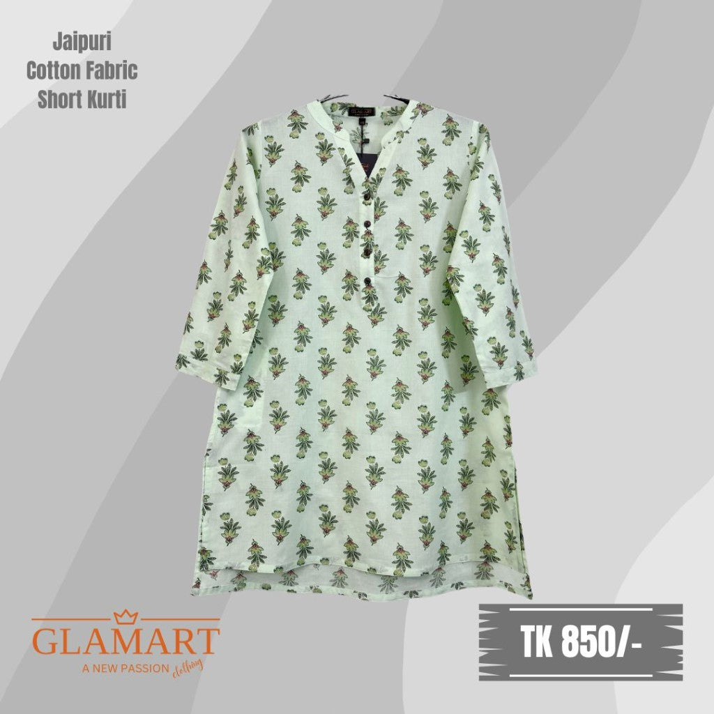 This Jaipuri cotton short kurti is designed for everyday comfort with a stylish look. It features a mandarin neck, 3/4 sleeves and one functional side pocket. The low-high cutting gives a modern fit, with the back length 1 inch longer than the front. The fabric is soft, breathable and comfortable for daily wear, office or casual outings.